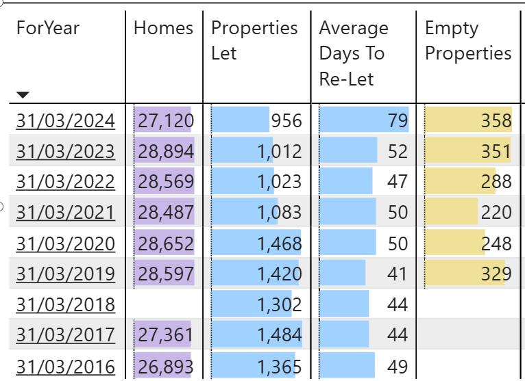 The number of Empty Properties for 2024 (358) is higher than an any time.