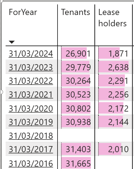Please note that the number of "Tenants" and "Leaseholders" is not the same as the number of people living in the properties.