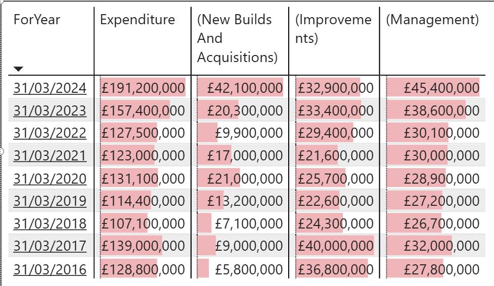 The biggest jump in expenditure was for "New Builds And Acquisitions" which increased from £20.3M in 2023 to £42.1M in 2024.