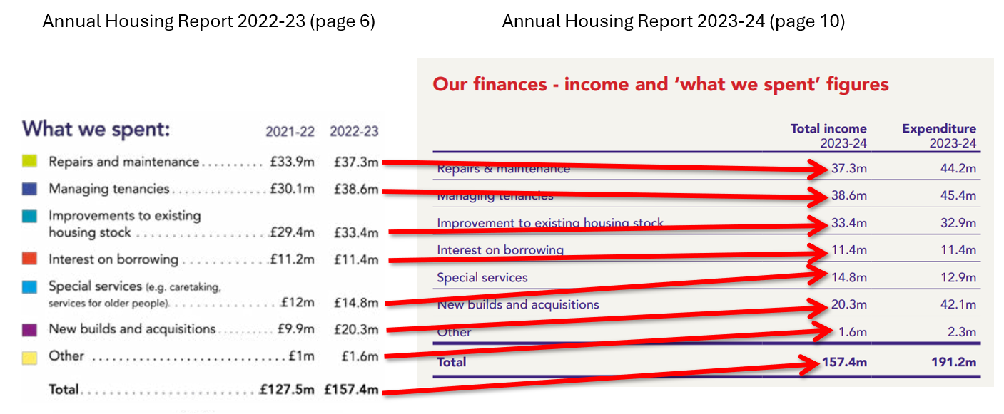 The screenshots below show that the "Total income 2023-24" figures actually come from the "Expenditure 2022-23" figures.