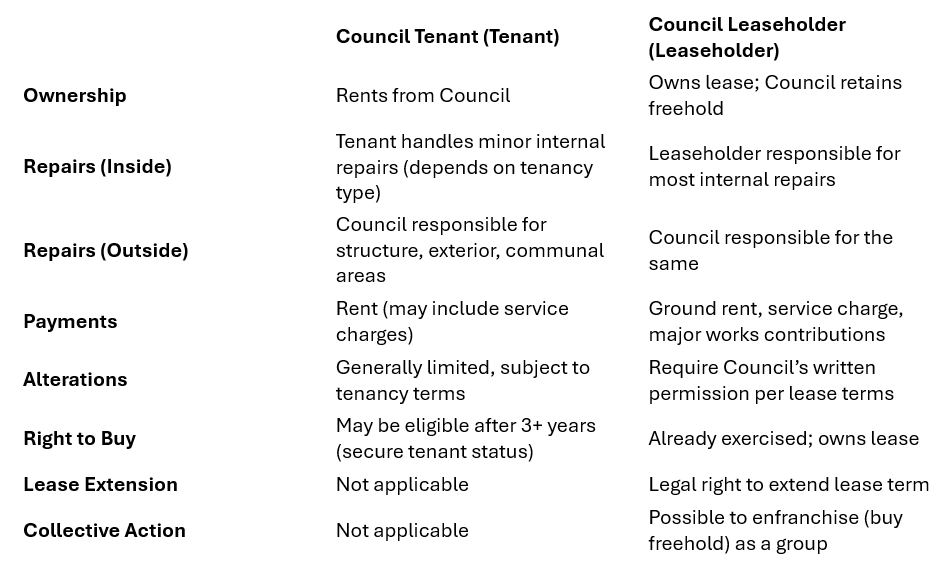 Here is a table that shows the key differences between Tenants and Leaseholders:
