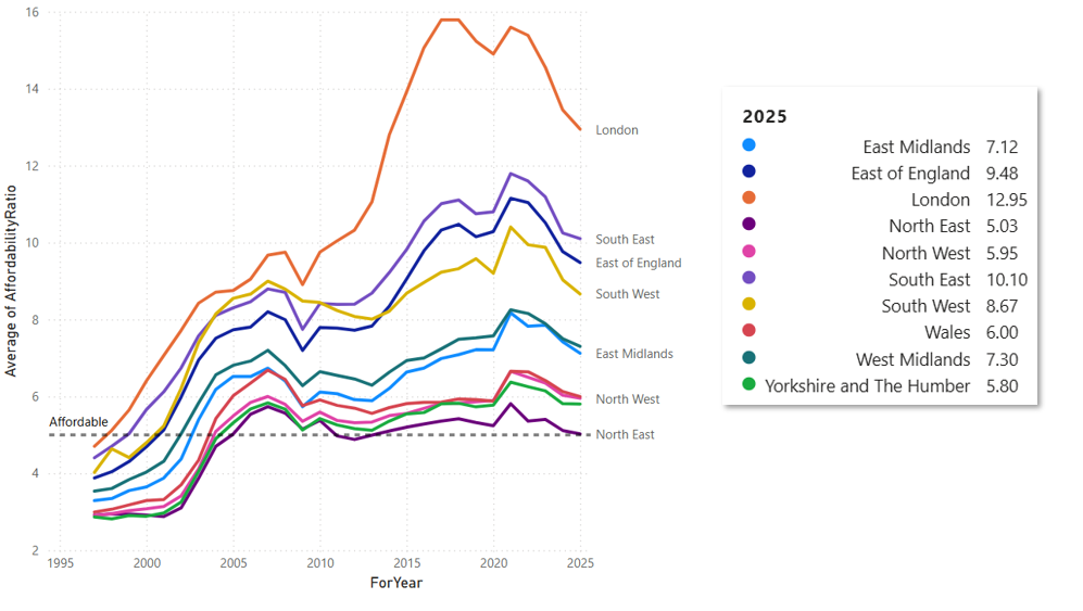 In 1997, the average sale price for a home in England and Wales was 3 to 4 times that of the average salary for a full-time worker. By 2025, these affordability ratios had doubled in both England and Wales, meaning the average house price was 6 to 8 times the average worker’s annual earnings in many areas.