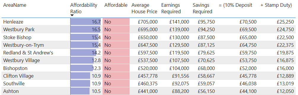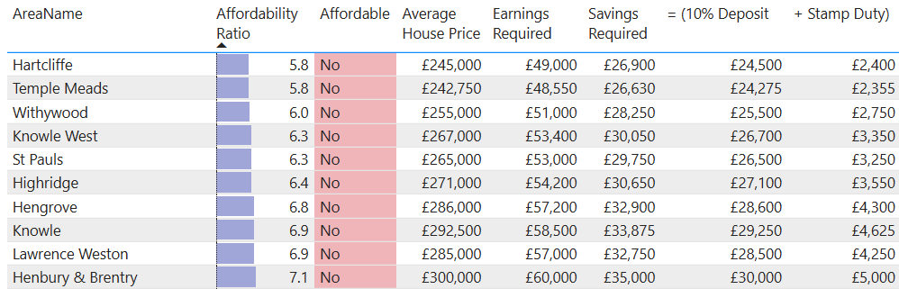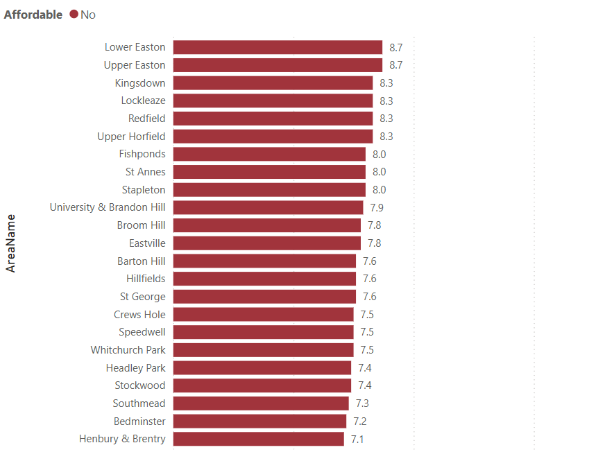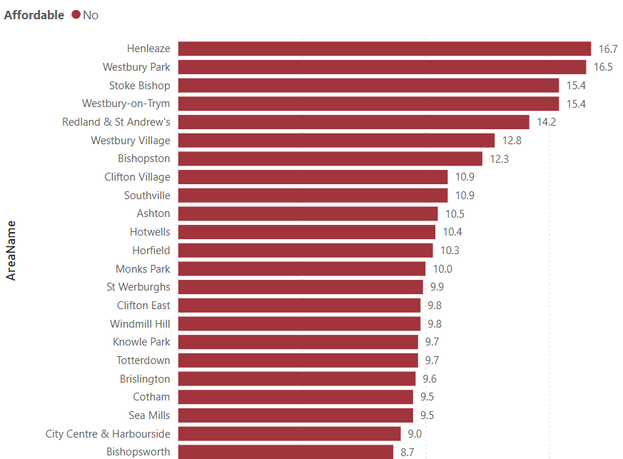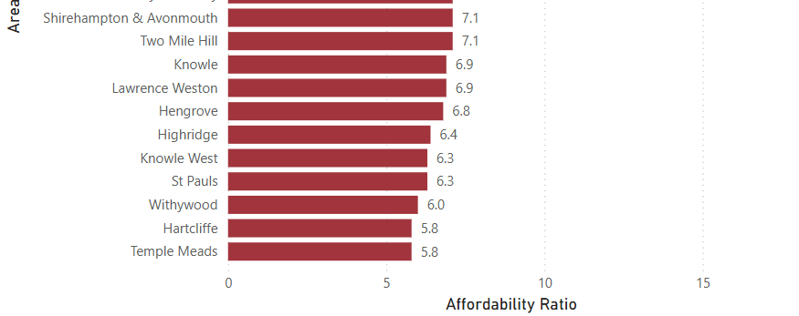 The chart below shows the Affordability Ration for areas of Bristol ranked from "Most Unaffordable" to "Least Unaffordable".