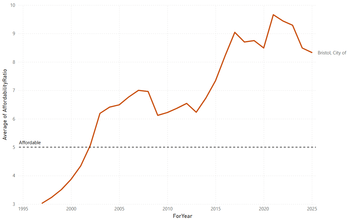 The last time housing in Bristol was "Affordable" was in 2001, with an Affordability Ratio of 4.34