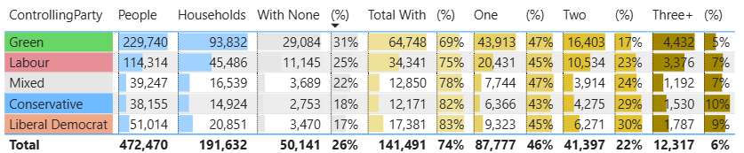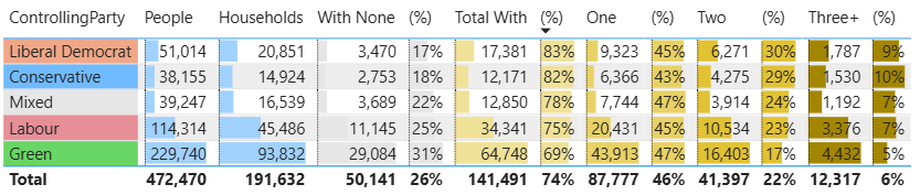 If we look at the ward data and party control we can see that in wards controlled by Greens 31% of households have no access to a car/van. This suggests that people without a car/van are more likely to vote Green.