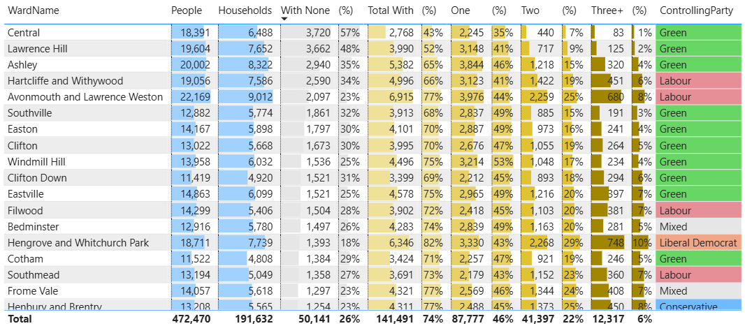 I have analysed the 2021 Census Data for Bristol Households and whether they have access to a car or van.