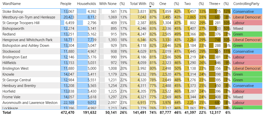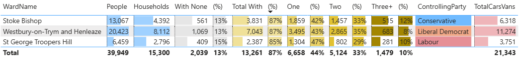 And this table shows the wards with the highest levels or car/van ownership.