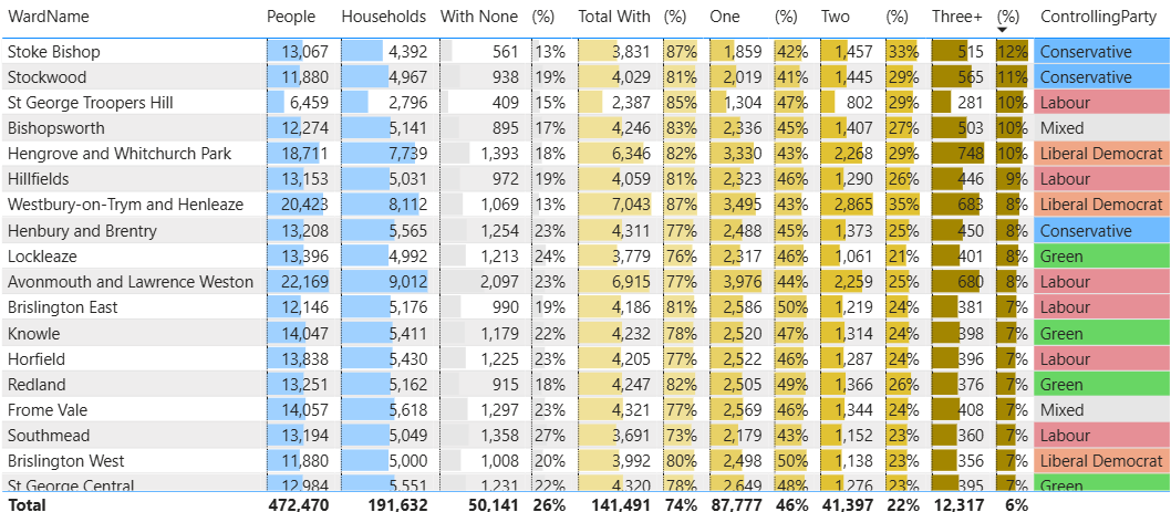 And this table shows the wards with the highest car ownership rates (3 or more cars/vans) in a household. 12% of households in Stoke Bishop had access to 3 or more cars/vans.