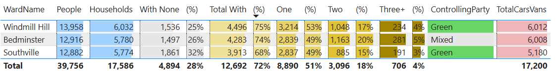 But if you look at the car/van ownership data for this area, it shows that 68% of households in Southville had access to a car/van. There were 5,180 cars/vans in Southville. When you look at the percentage of households with vehicles Southville comes 29th out of the 34 wards.