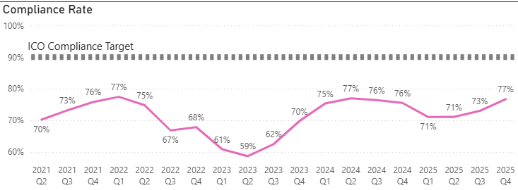 BCC have published their FOI Performance Numbers for 2025 Q4 (Oct to Dec 2025). Whilst their compliance rate (%ge of responses provided within the statutory deadline) has risen to 77%, this is still well below the ICO Target of 90%