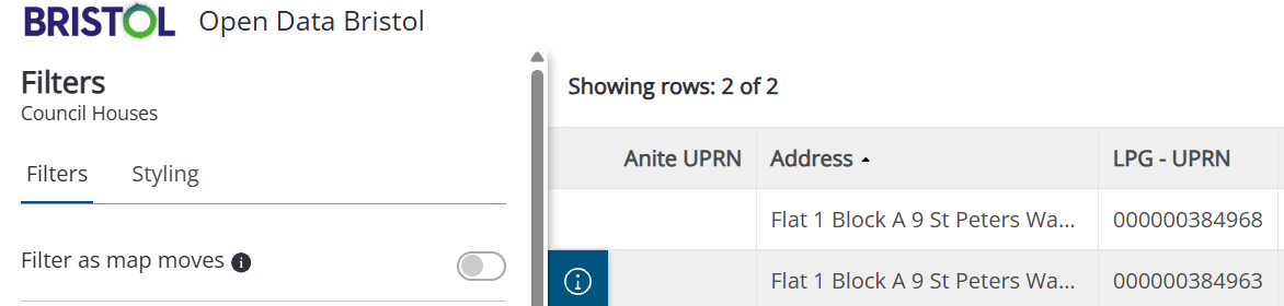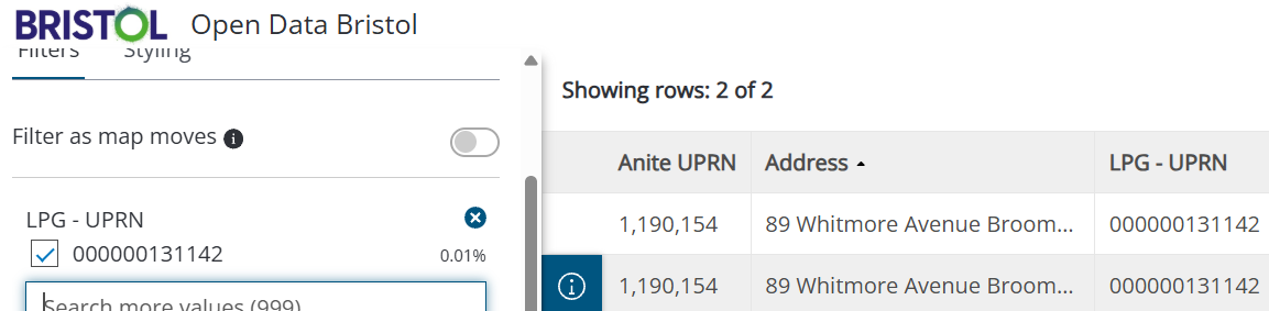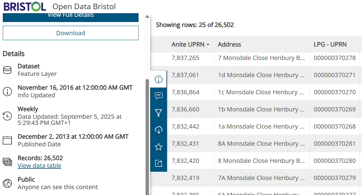 The Unique Property Reference Number (UPRN) is the unique identifier for every addressable location in Great Britain. Looking at the BCC Council Property data set there are dozens of different properties that share the same UPRN. This should not be possible as each property (including flats) should have a unique number.