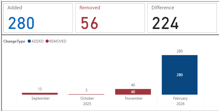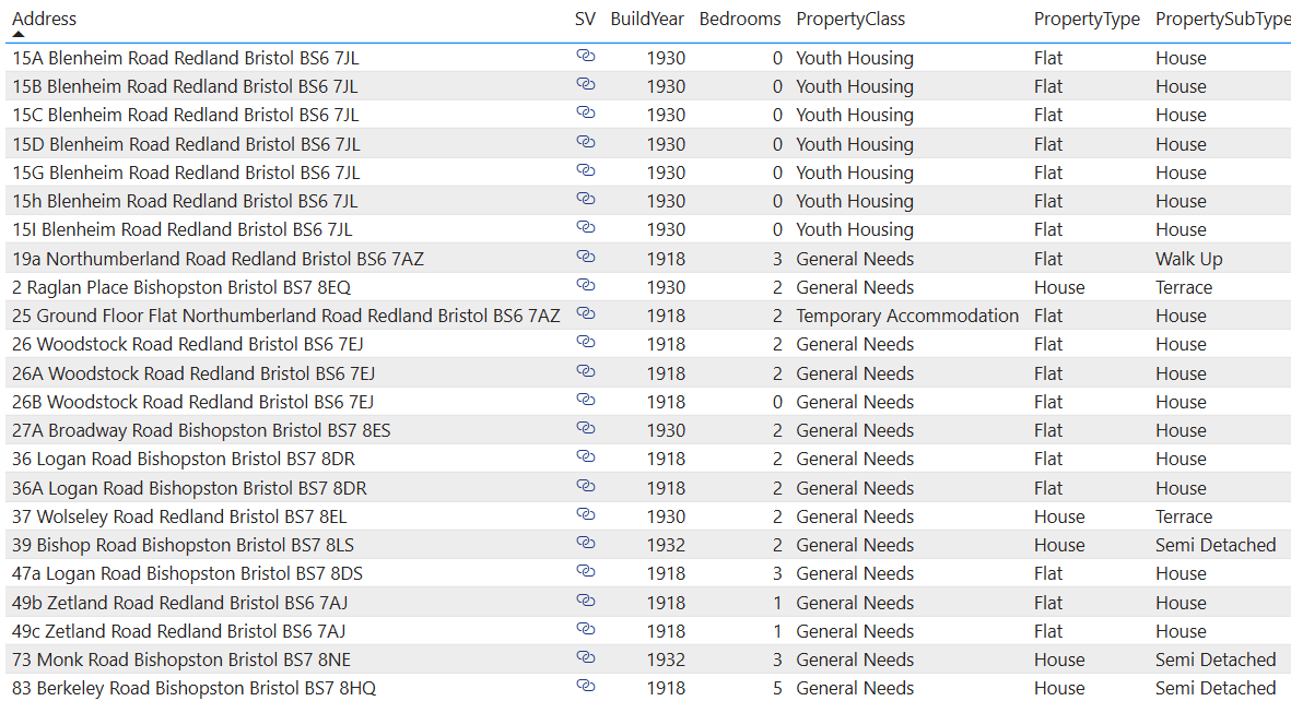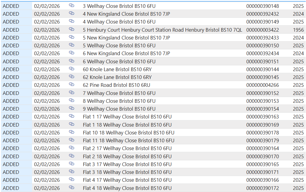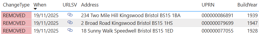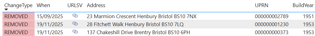 I have been collecting this data every time it has been updated since September 2025. If a property disappears from the data set, then it must have been disposed of by BCC. If a property appears, then it must be new. By analysing the data in this manner I can produce reports on the council properties removed and added since September 2025. The properties that have disappeared from the list might have been sold under the Right to Buy scheme, or they could have been sold to third parties under the Asset Review Policy.