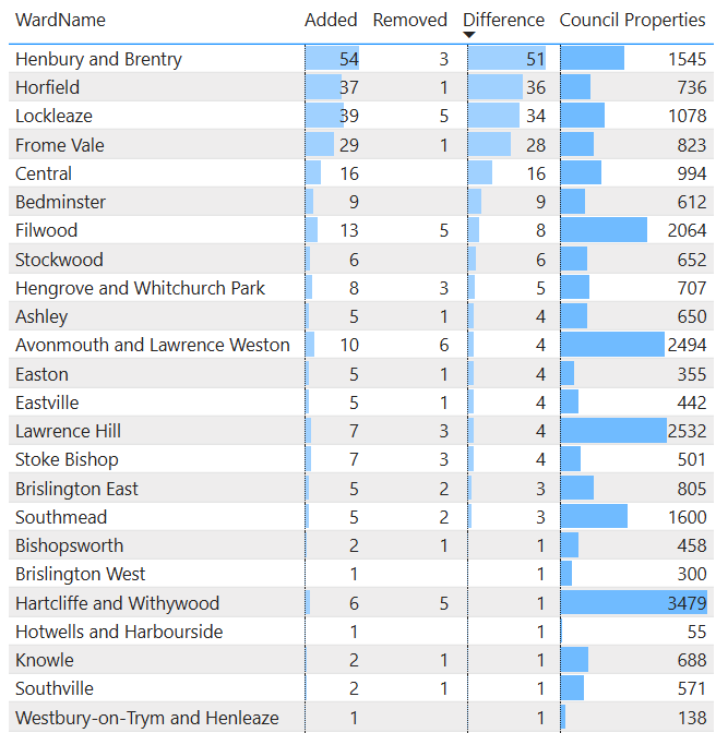 Henbury & Brentry have gained 55 Council Properties and lost 3: