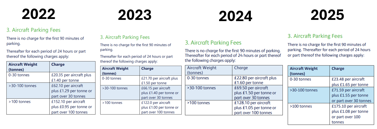 Since 2022 the parking charge for a 50 Tonne Plane at Bristol Airport has increased by 16.7% from (£87.90 to £102.59). This is for 24 hours of parking (the first 90 minutes are free).
