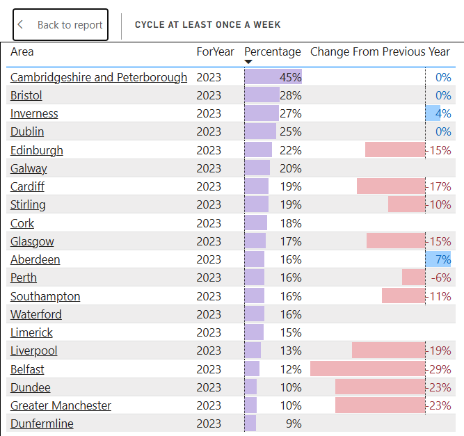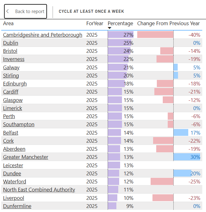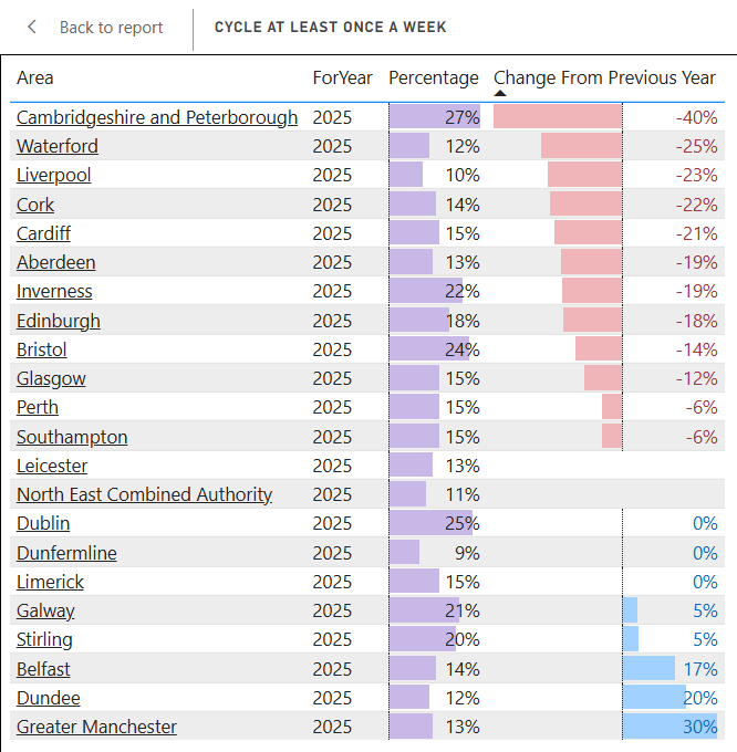 Looking at the changes between 2025 and 2023 we can see that Bristol is not alone in seeing a reduction in residents who cycle at least once a week. But Greater Manchester reported a 30% increase.