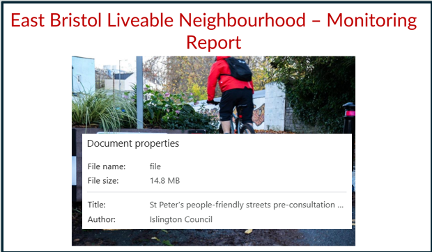 When you inspect the document properties for the EBLN Monitoring Report, it shows that the document title is "St Peter's people-friendly streets pre-consultation monitoring report" and the author is "Islington Council".
