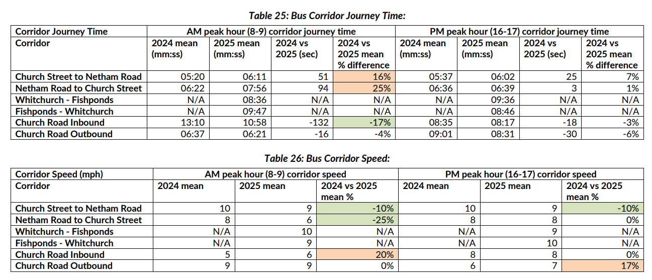 In the Journey Time table, routes where the journey time has increased by more than 10% are orange (bad), and green (good) where the journey time has reduced by more than 10%.