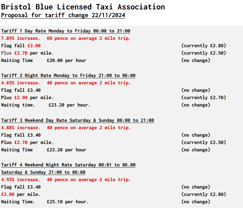 Bristol Hackney rates were last increased in April 2025. There have not been any proposed increases for April 2026.