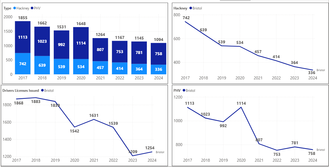 - The total number of Taxis licenced in Bristol has dropped by 41% since 2017.