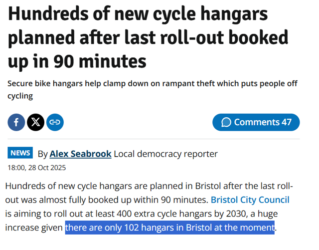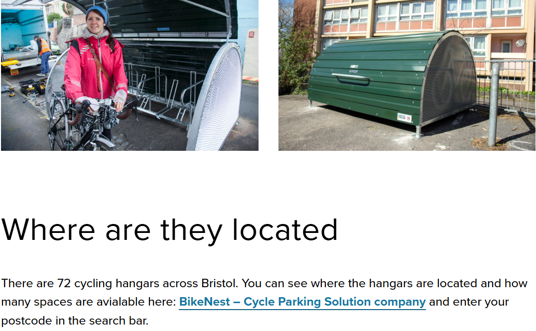 In Oct 2025 BL reported that there were 102 cycle hangars in Bristol.