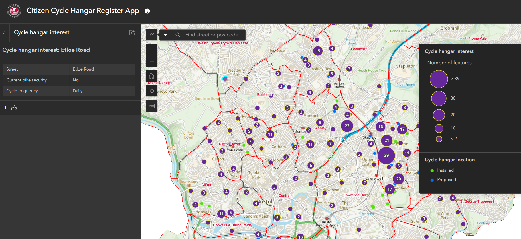 The Cycle Hangar Service Map currently reports that there are 32 installed cycle hangars in Bristol, with another 39 proposed, resulting in a total of 71.