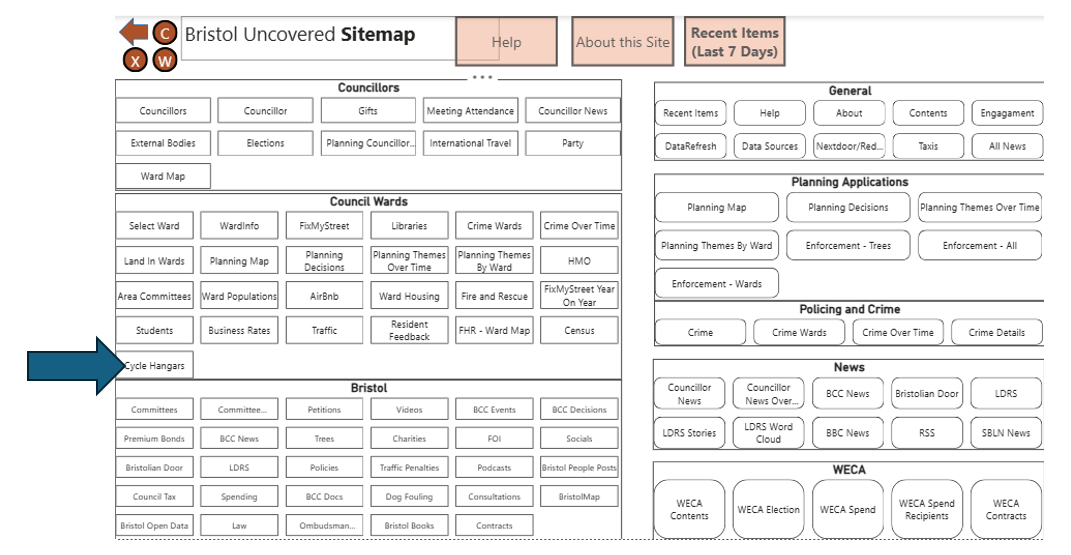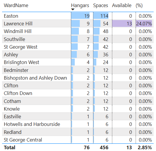 BikeNest manage the cycle hangars on behalf of BCC, and the data taken from their interactive map shows there are currently 76 cycle hangars in Bristol.