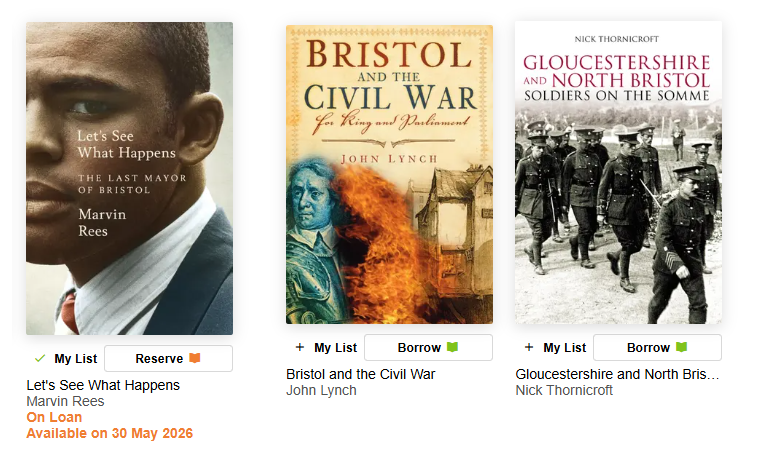 You can also borrow books, but if you want to borrow the Marvin Rees biography you will have to wait until it comes back from loan on 30 May. But there are other Bristol related books that are available to borrow now.