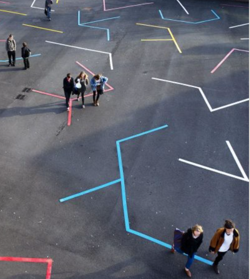 The work is derived from a grid pattern we have used throughout our practice and has been made with the type of thermoplastic material used for road markings, playgrounds and sports courts.