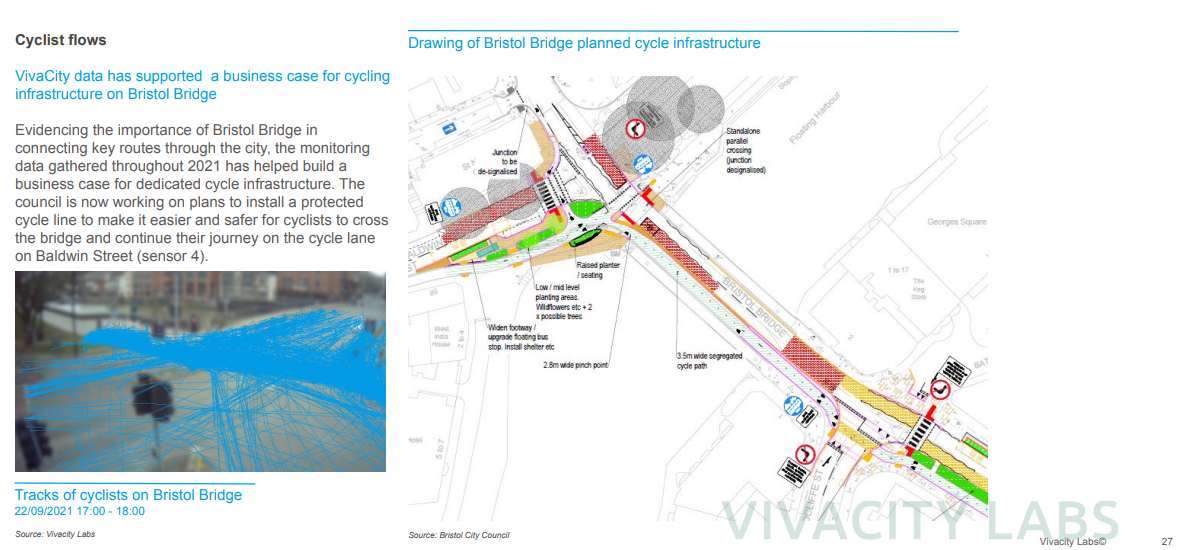 BCC have been using VivaCity since 2021 and analysis of some of this data can be viewed in the "Bristol Cycling Trends" report from 2021.