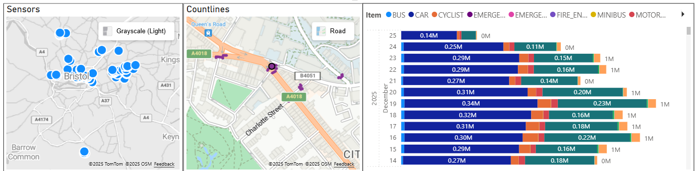 For example, "Sensor 19" on Blackswarth Road (St George West) monitors 6 different "Countlines".