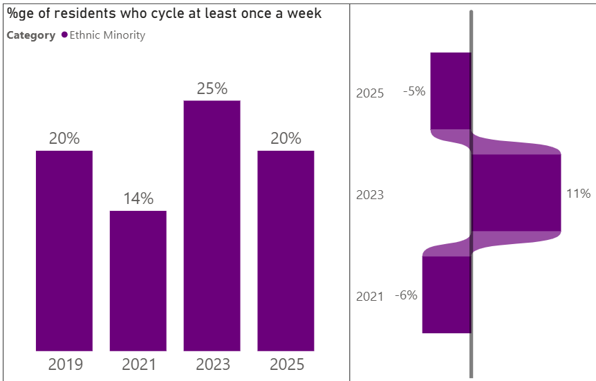 Looking at the reports over the years, they have reported the measure of "Residents who cycle at least once a week", but in the most recent report they didn't call out the reduction of 4% from the 2023 figure. You might think that the first ever drop in this measure (from 28% to 24%) is something that should be reported on.