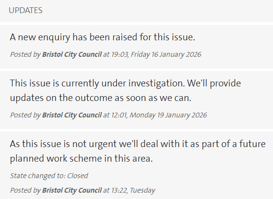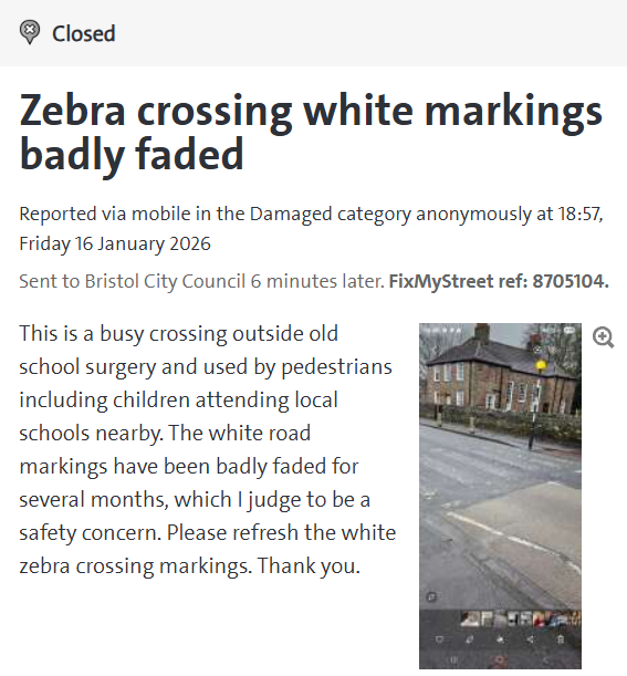 As I reported last week in "Broken Bristol", the Council recognise that they do not have the funds to maintain our highways and repairs have to be rationed. Surely Zebra Crossings should be at the top of the priority list.