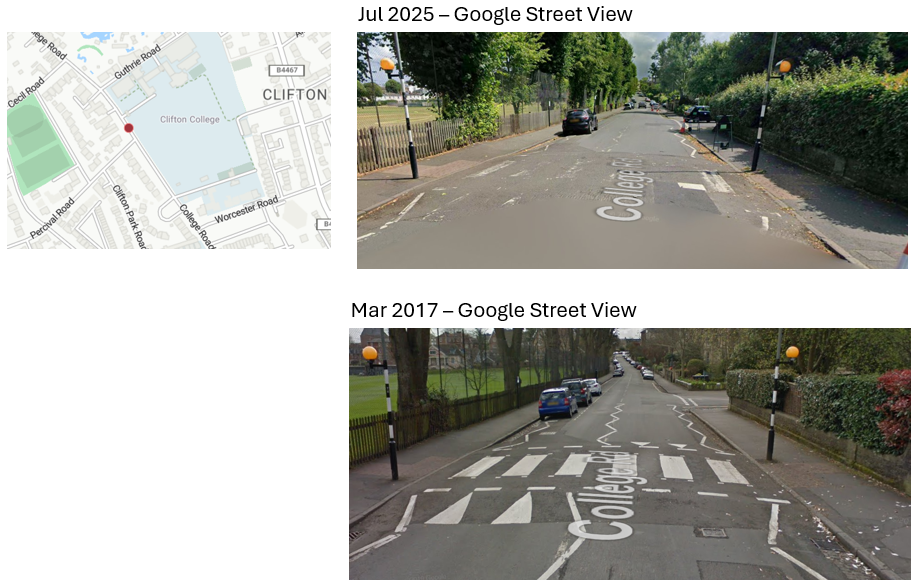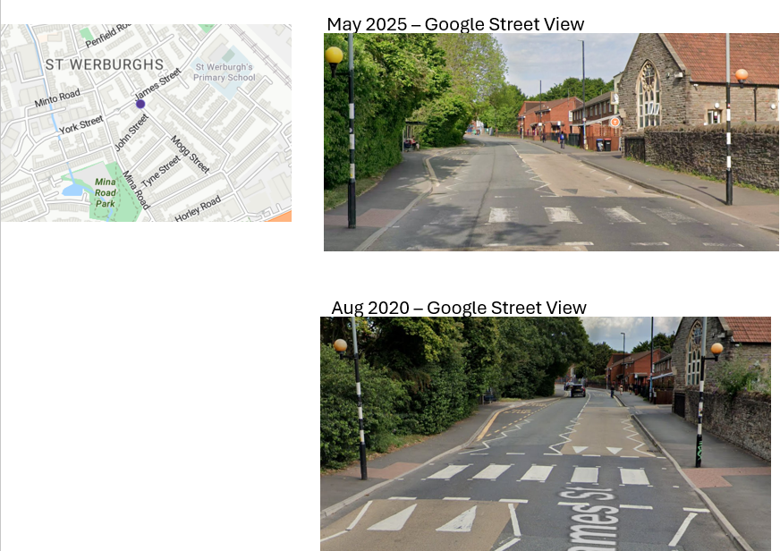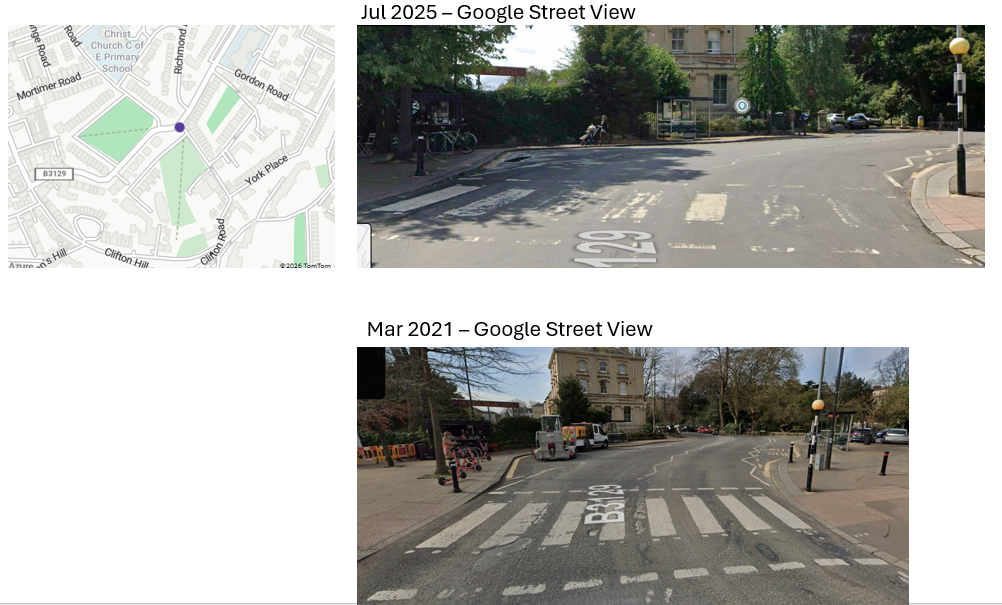 This is what the Manor Road Zebra Crossing looked like in Aug 2025 (image from Google Street View):