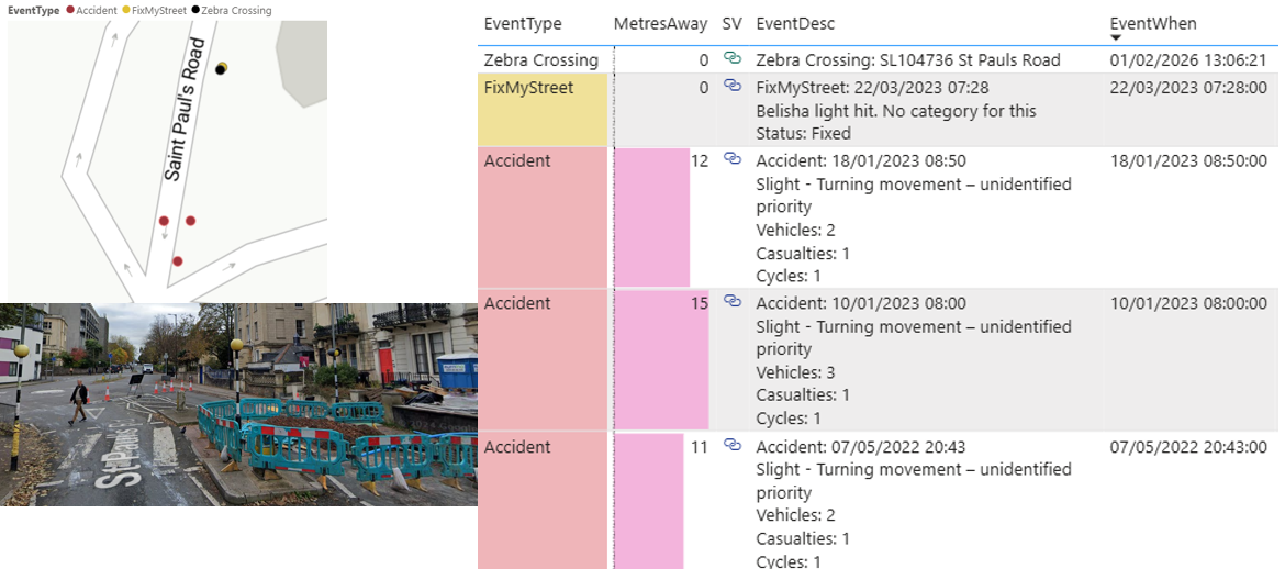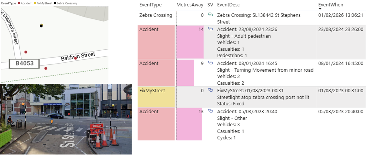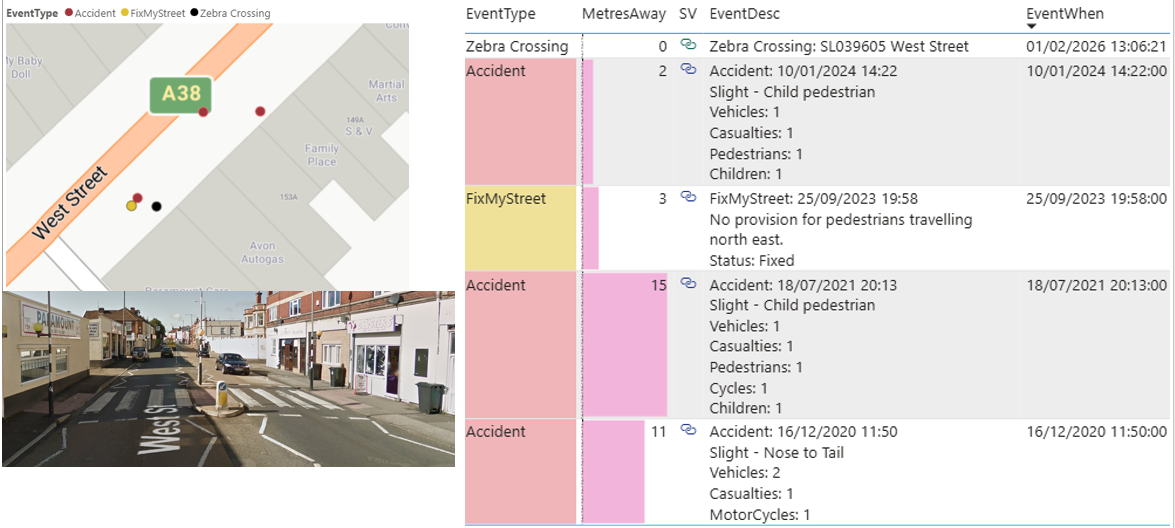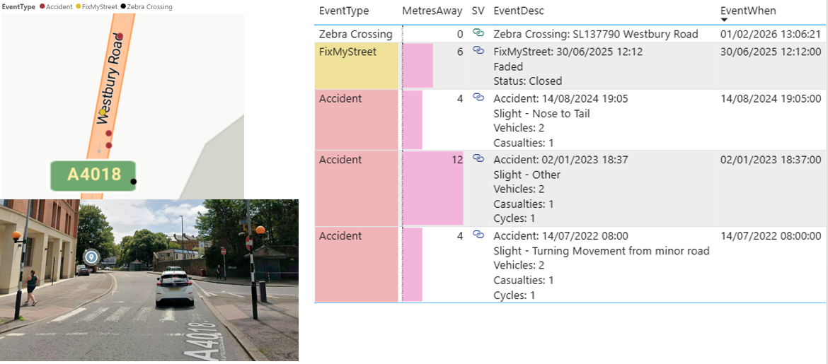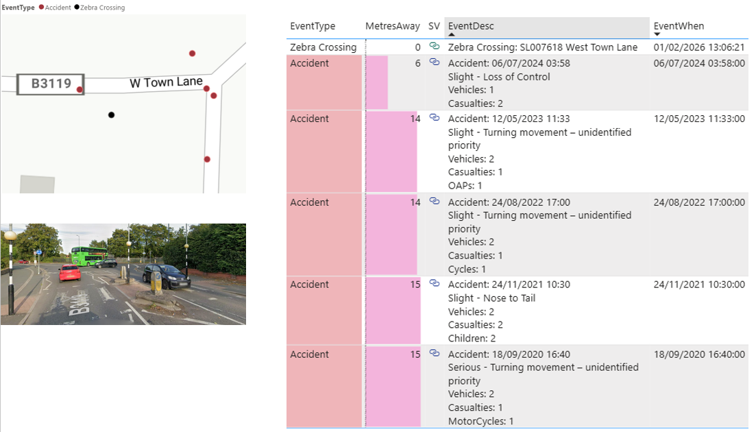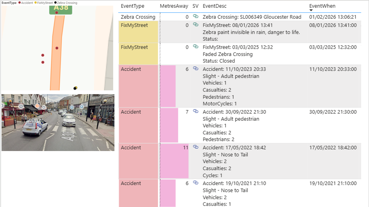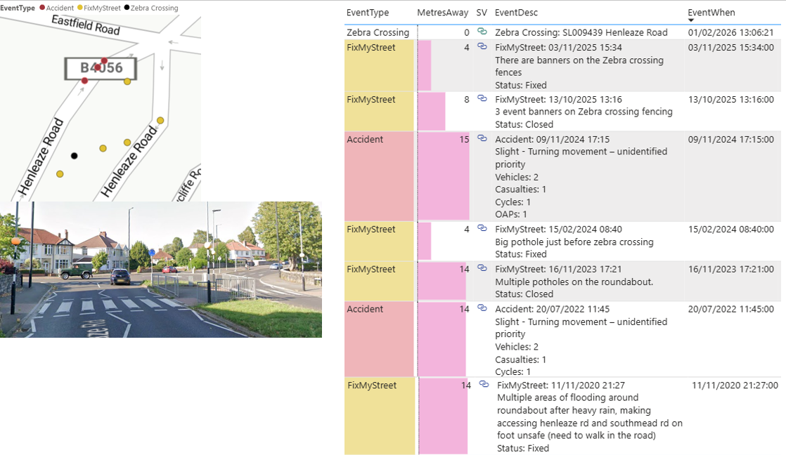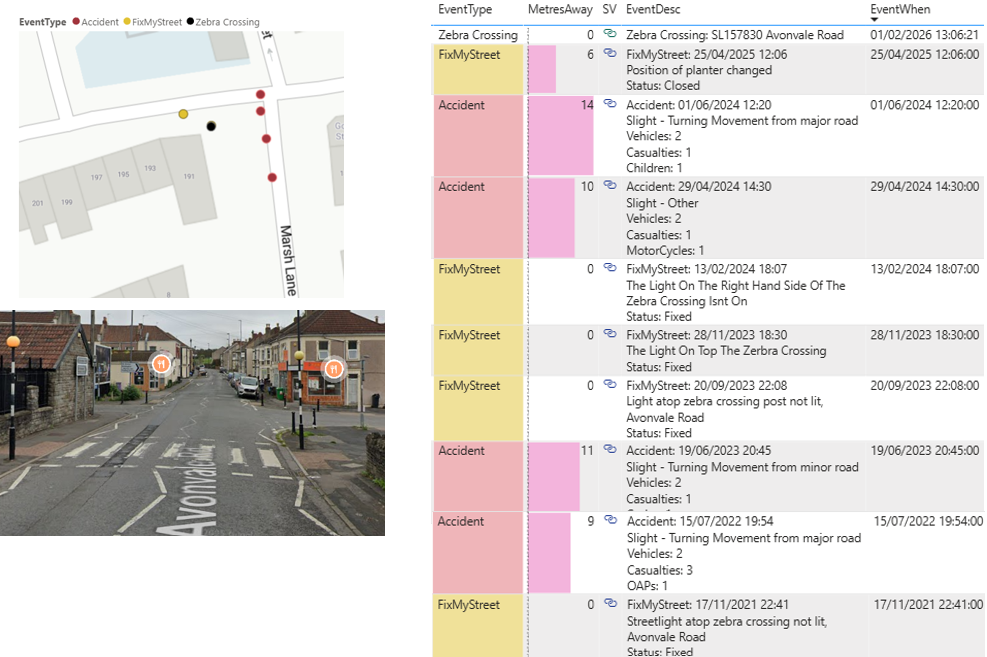 I have taken the data for Traffic Accidents within 20 metres of Zebra Crossings and combine it with FixMyStreet reports related to Zebra Crossings. This gives an indication of which Zebra Crossings are most dangerous. Data for Traffic Collisions is only available to the end of 2024.