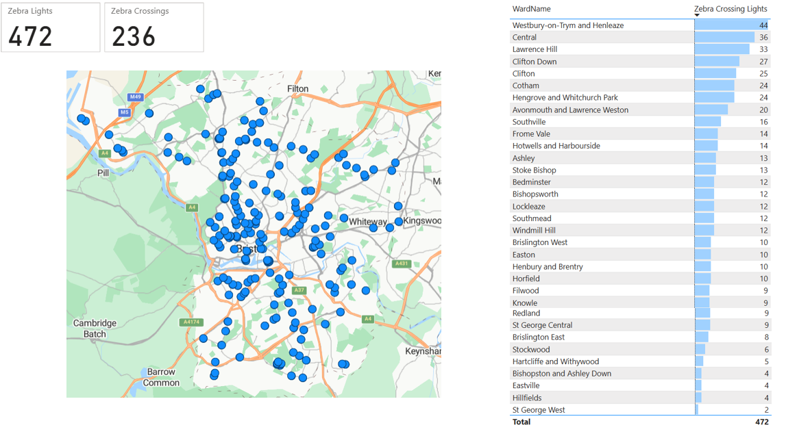 There are approximately 236 Zebra Crossings in Bristol (according to Bristol Open Data). The Bristol Open Data provides the number of Zebra Lights, which I divide by two in order to estimate the number of crossings.